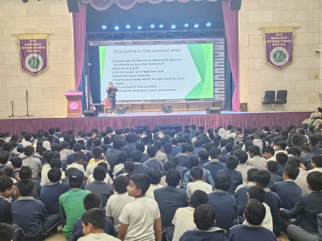 On April 9, 2025, DPS-Monarch International School organized a Discipline Orientation for students of Grades 5 to 8, led by the Middle School Discipline Master, Mr. Parvez Shaikh. The session aimed to instill values of responsibility, consistency, and self-awareness in students navigating a key transitional stage in their development.