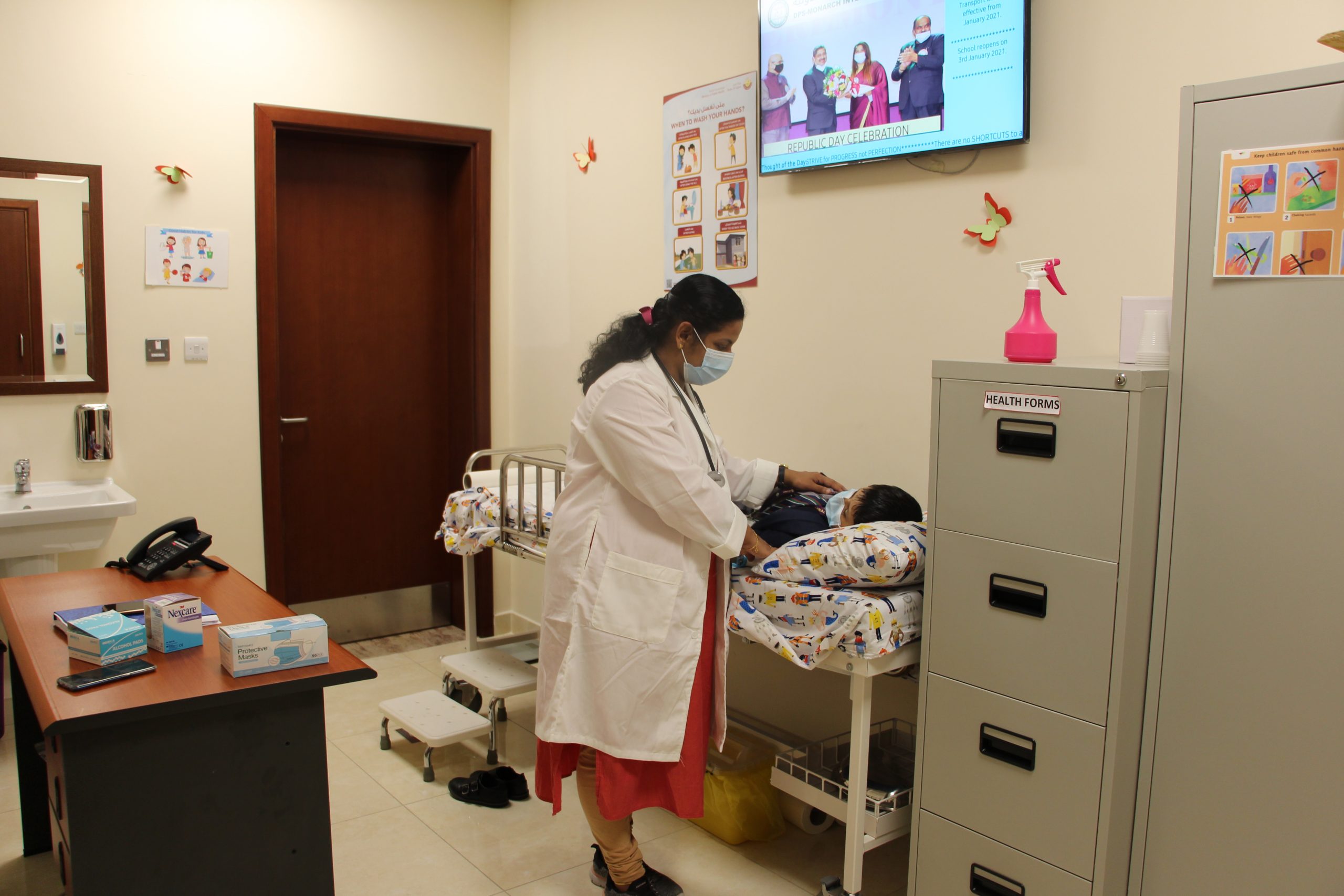 For children requiring any medical aid, the school has a well-equipped Sick Bay that provides basic First-Aid facilities as and when necessary. A well-qualified nurse is present throughout the school hours to attend to any emergency. The school also conducts regular medical check-ups of the children. Parents are kept informed of their well-being.
