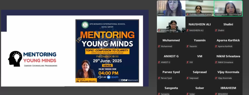 DPS Monarch International School is delighted to share the highlights of a highly informative and engaging online career counselling session conducted by Ms. Bhavyata Bendre for students and parents of the secondary section on 29th June,2025. Held via Zoom, the session aimed to empower students with the knowledge and tools needed to make confident academic and career decisions.